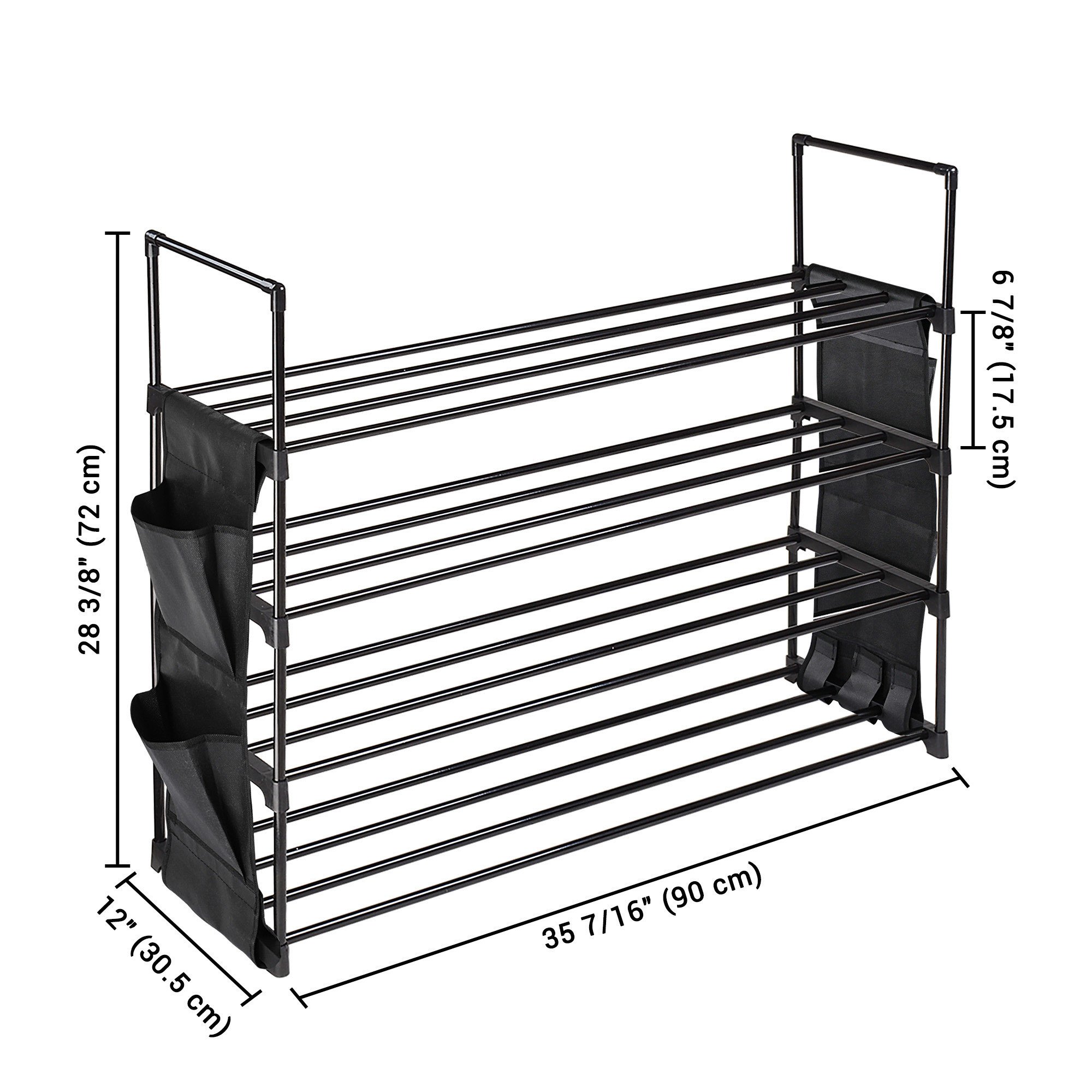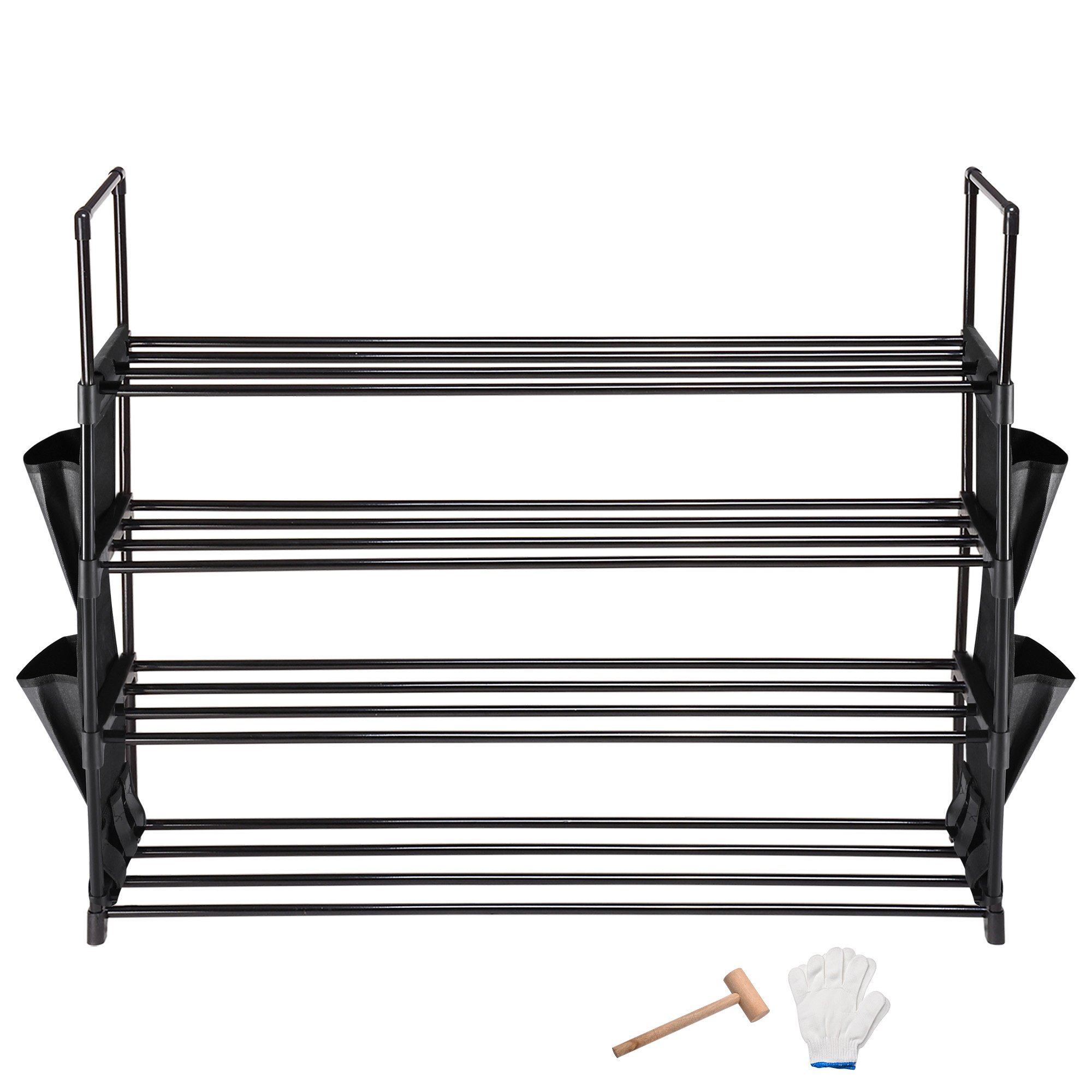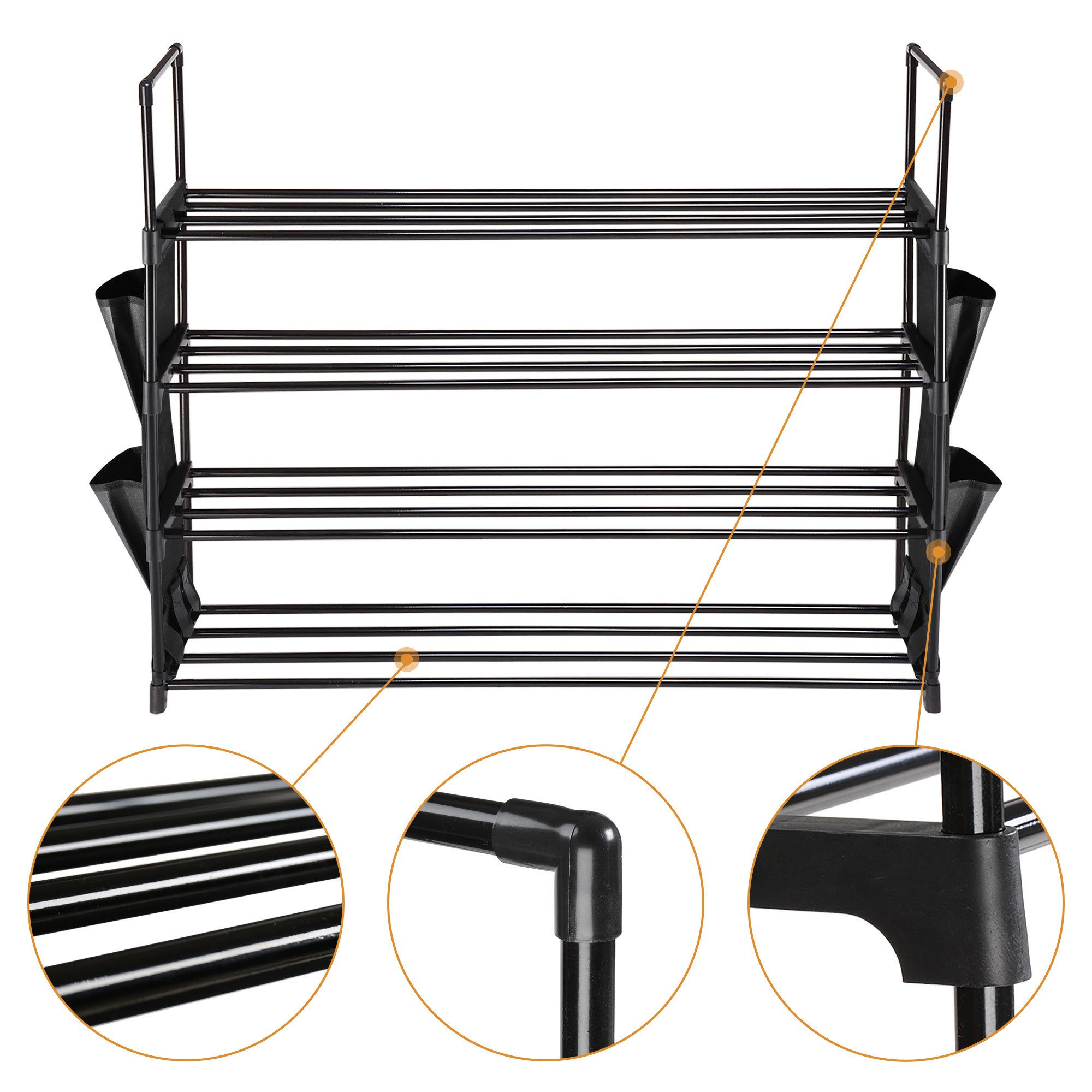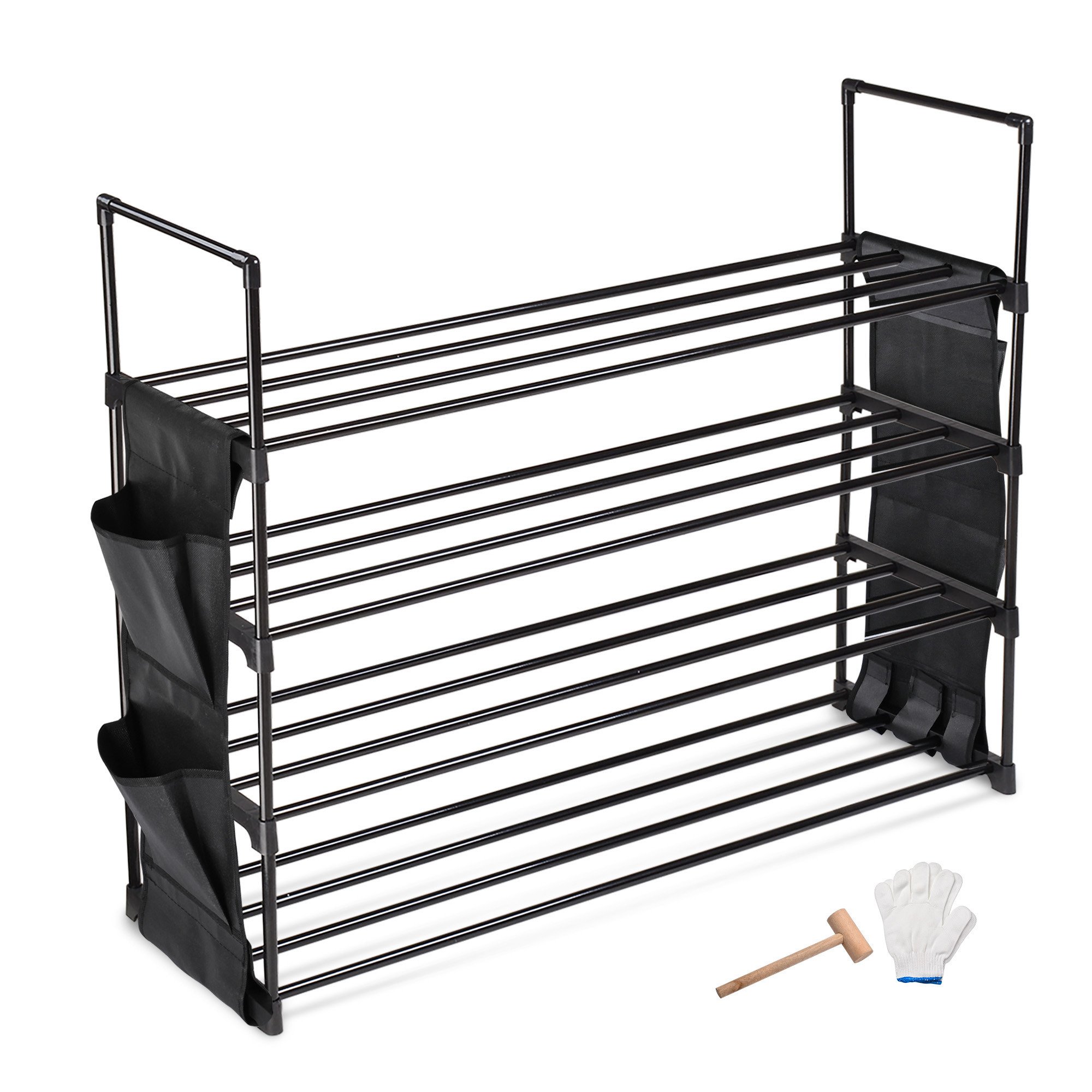 - 4-Tier Versatile Organizer - 4-Tier Shoe Rack is able to hold 16 shoes in total; perfectly holding sneakers; high heels and boots or other items like umbrellas; with 4 side pockets to provide extra storage for slippers; bags; shoe brushes; More racks for more shoes; helps sorting your shoes by different shelves to keep them tidy