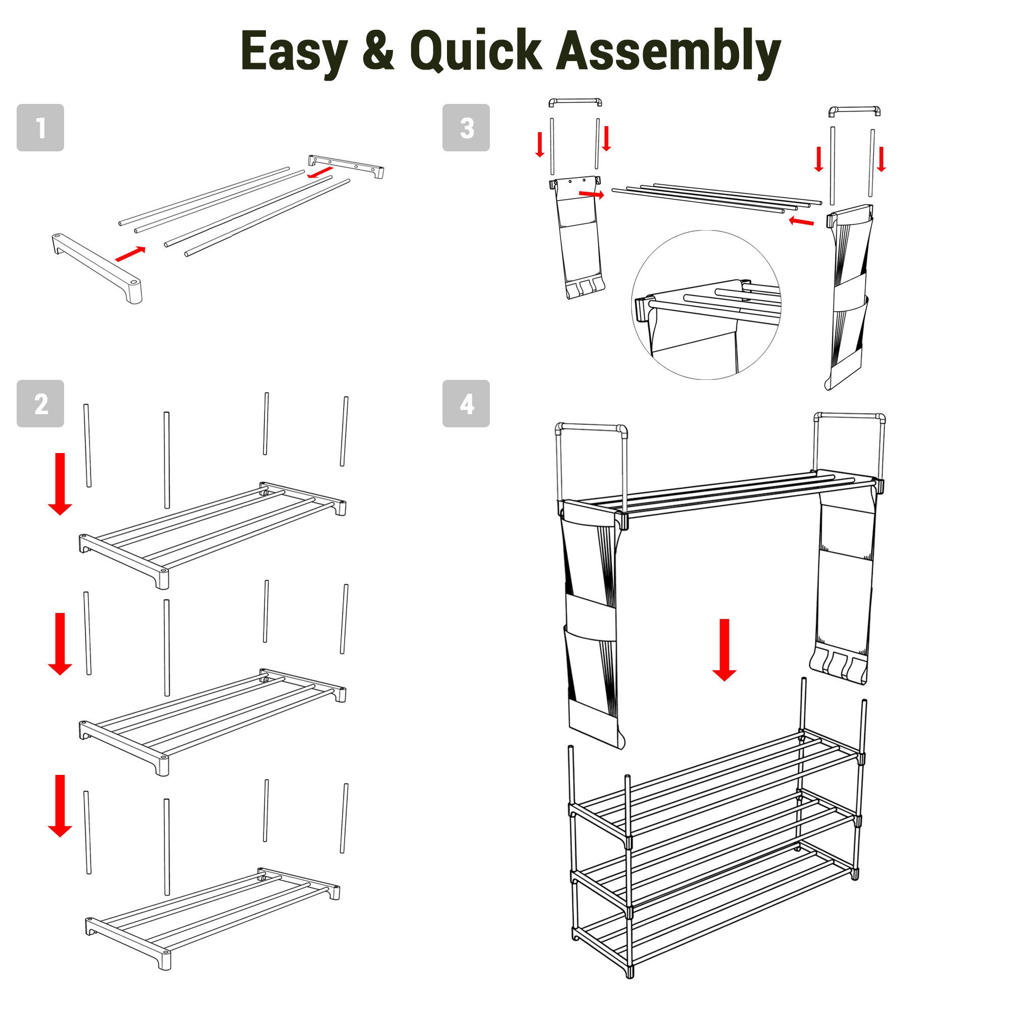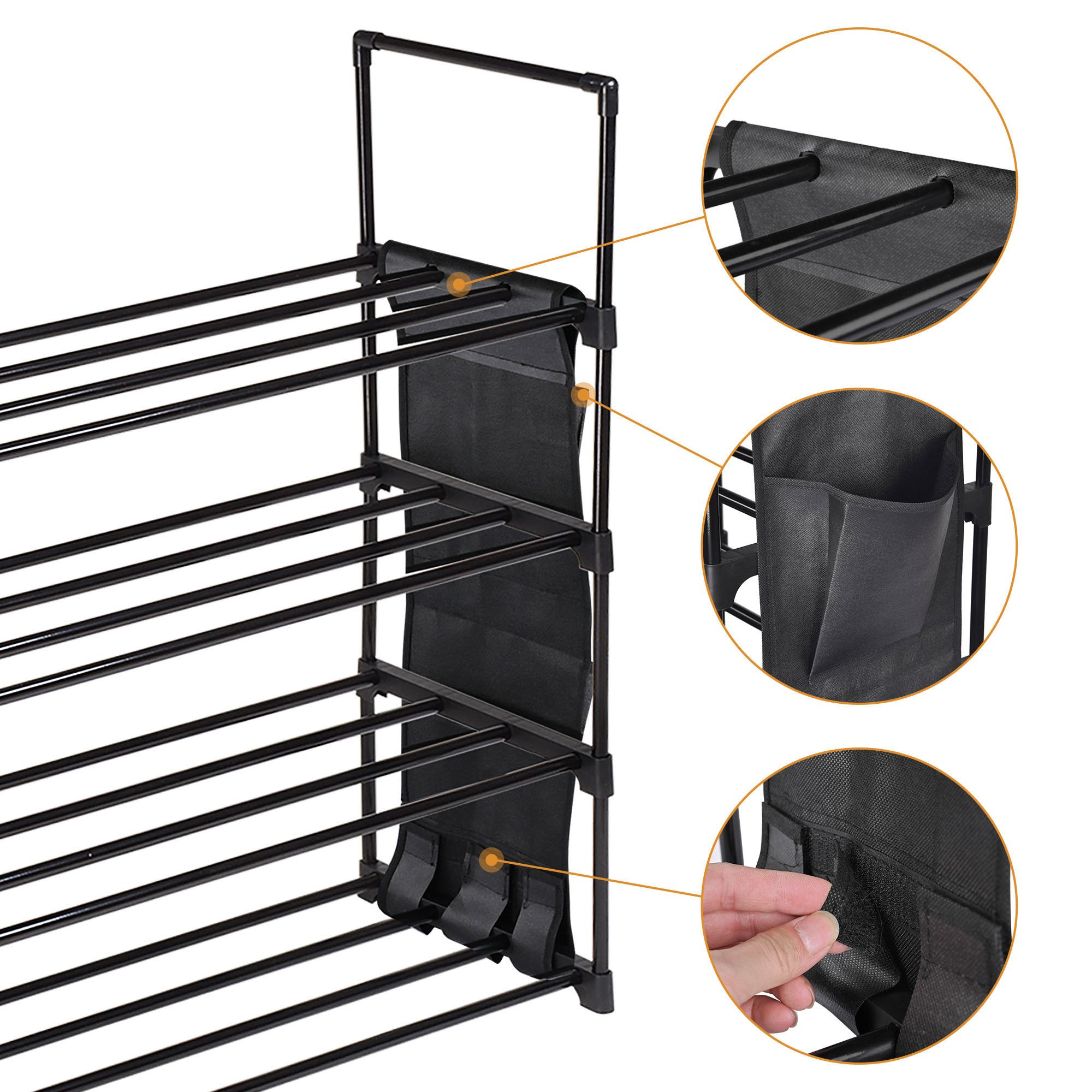 - Simple & Customizable Assembly - Tool-free and fast installation; installing side pocket fabric into pipes and connecting pipes with connectors to set up; easy and quick DIY the organizer; assemble it into different tiers as you like; also you can take out a middle layer for holding long boots