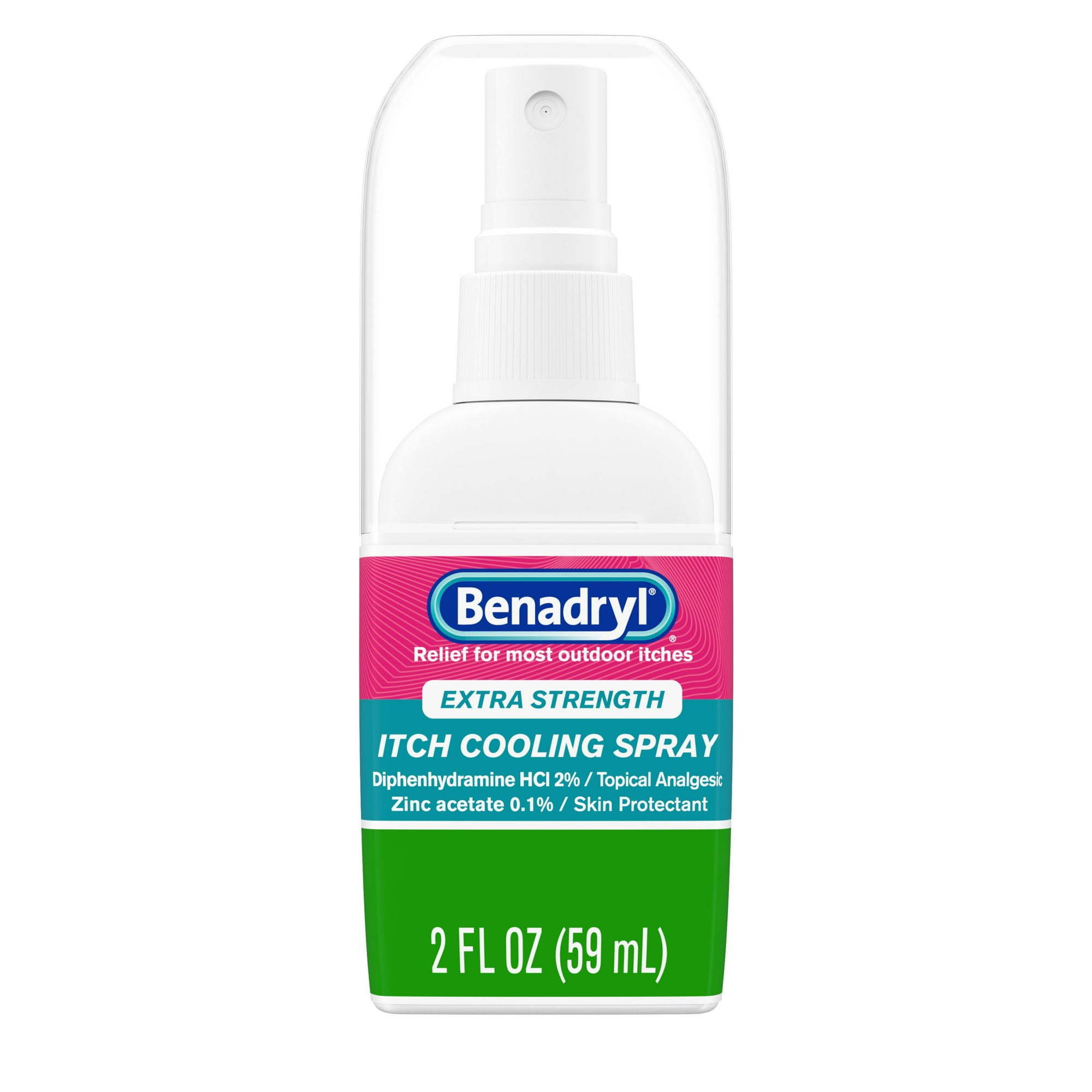 Benadryl Extra Strength Anti-Itch Cooling Spray provides fast relief from skin irritation and itching. Made with 2% diphenhydramine HCI topical analgesic and 0.1% zinc acetate skin protectant; this itch relief spray begins to work on contact to relieve the pain and itching associated with most outdoor itches including insect bites; sunburn; scrapes; and minor skin irritations; burns; and cuts. It also dries rashes caused by poison ivy; poison oak; and poison sumac. Benadryl Extra Strength Itch Cooling Spray works when you need it most and is intended for ages two and up.
