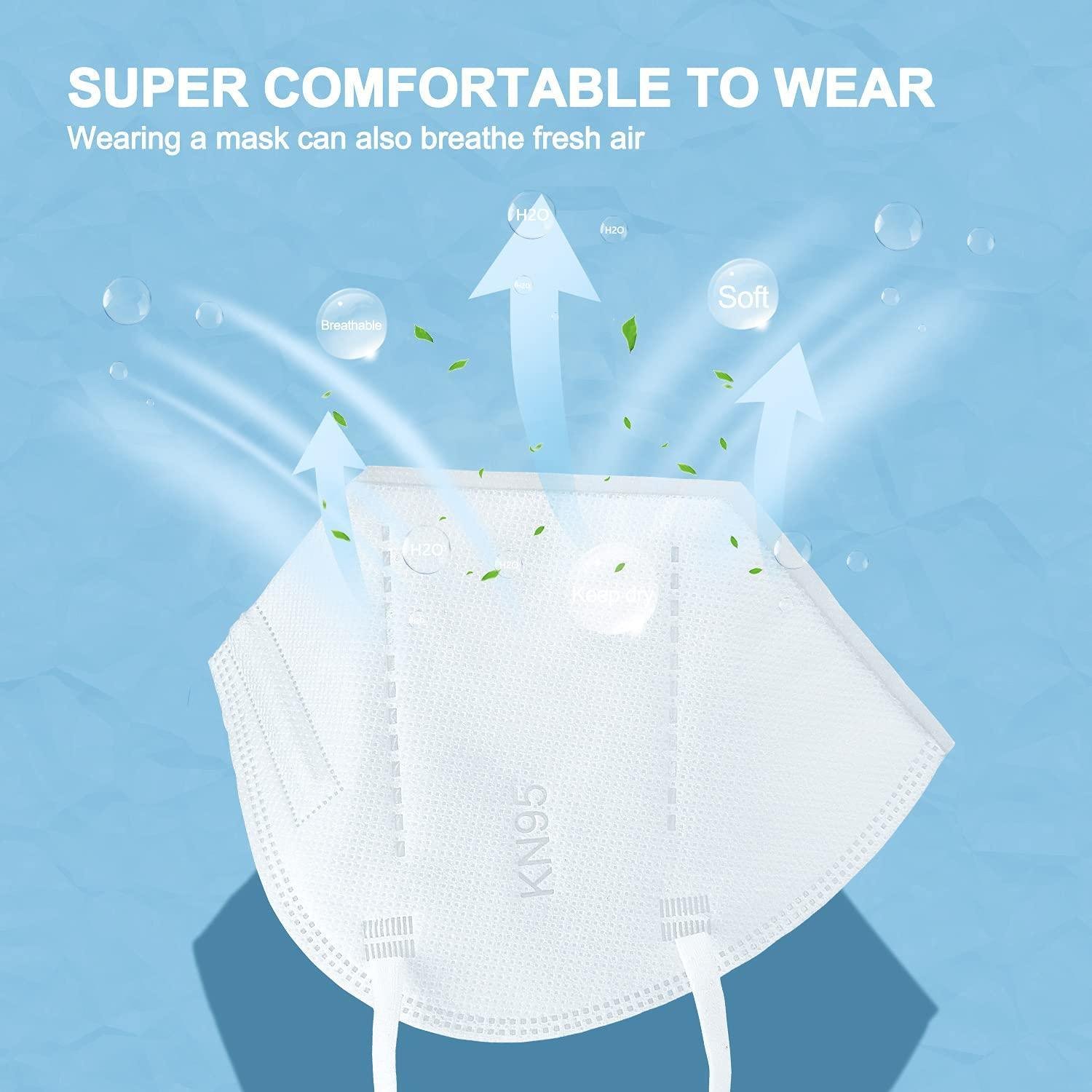 [ 5-Layer Face Mask ] 5-ply KN95 face mask is protective and high filter efficiency. The outermost 1 layer non-woven fabric can filter large particles; middle 2-layer melt-blown fabric can block more then 95% particles; 1 layer hot air cotton can filter pm2.5 and the innermost 1 layer non-woven fabric is skin-friendly and softer that give you the comfortable usage experience at the same time it protects your breath with high filter efficiency.
