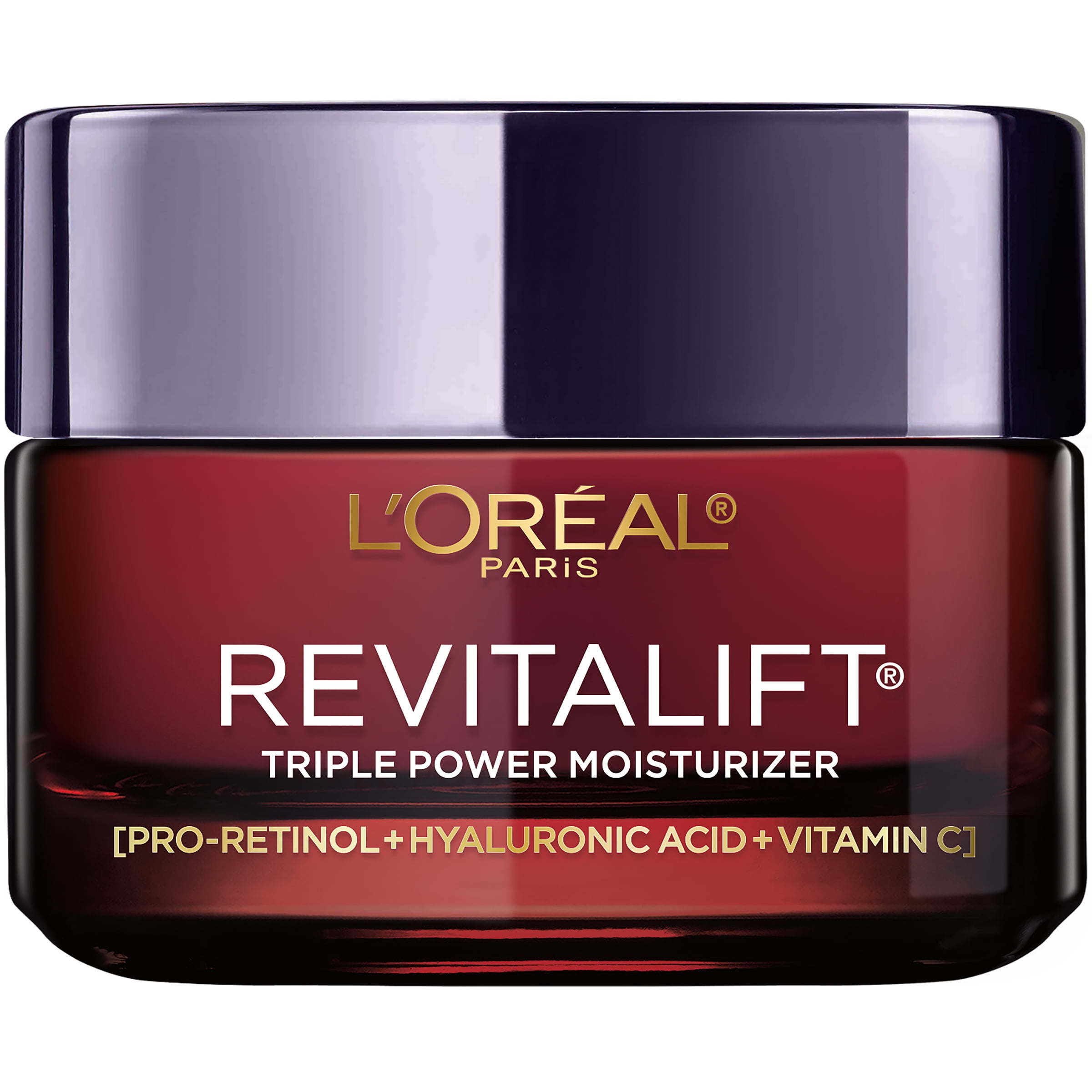 L'Oreal Paris Revitalift Triple Power Face Moisturizer; formulated with 3 of the top derm-recommended ingredients: Pro-Retinol; Hyaluronic Acid and Vitamin C to reduce wrinkles; firm and brighten in 1 week. After use skin feels smoother; softer; refreshed. Dermatologist tested; suitable for sensitive skin. Paraben free; mineral oil free; dye free; allergy tested. Layers well under makeup. Now; also available in Fragrance Free and SPF 30