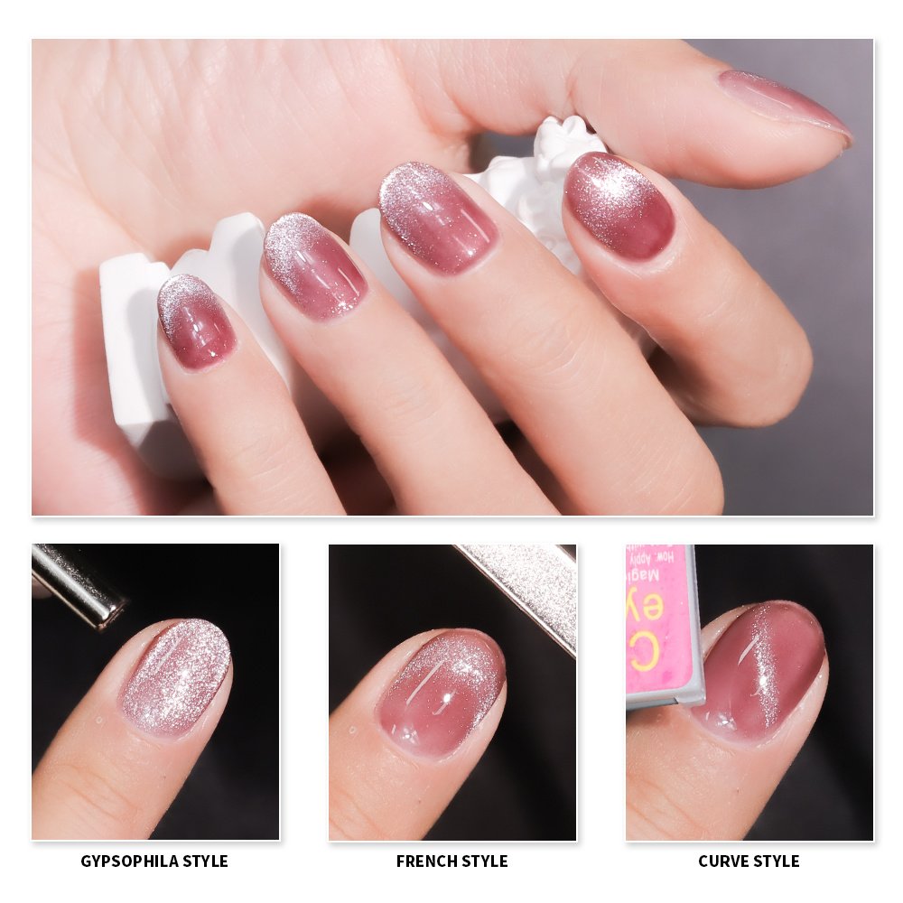 Step 5. Apply cat magnetic uv gel, do not cure and put the magnet over the nails for 10-15 seconds to get the cat meganetic effect,and then immediately cure with UV lamp for 2 minutes or cure with LED lamp for 60 seconds.