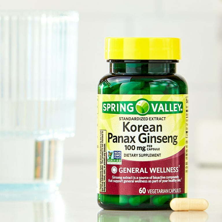 Spring Valley Korean Panax Ginseng Vegetarian Capsules is a dietary supplement designed for general wellness. Ginseng extract is a source of bioactive compounds that improve general wellness as a part of your healthy diet.* Suggested adult dosage is simply two capsules per day, preferably with meals. These vegetarian capsules are free of gluten, yeast, wheat, milk or milk derivatives, lactose, soy, and sugar and they contain no artificial preservatives, colors, flavors, fragrance, benzoates, coal tar dyes, MSG, phthalate, or non-intent BPA. You can rest assured that Spring Valley Korean Panax Ginseng Vegetarian Capsules is produced with strict quality guidelines and is backed by our quality guarantee.