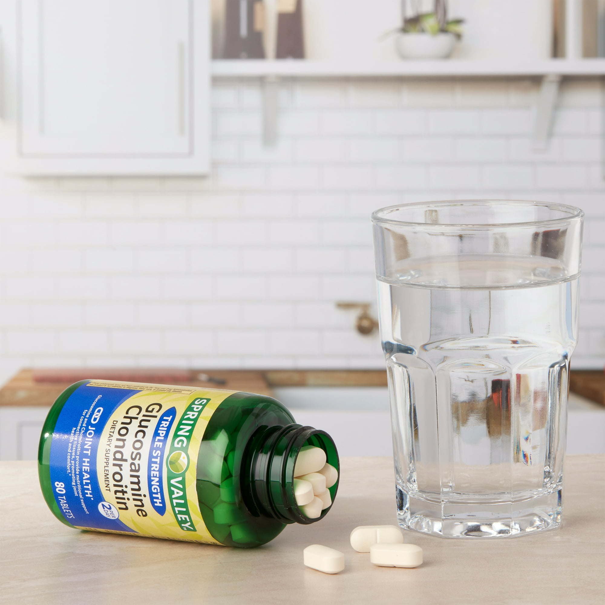 Spring Valley Triple Strength Glucosamine Chondroitin Dietary Supplement Twin Pack is designed to provide joint health support. Glucosamine and chondroitin provide nutritional support for connective tissues; promoting joint health and comfort. The suggested adult dosage is two tablets daily; preferably with a meal. These tablets are free from gluten; artificial colors or flavors; sugars; and lactose. You can rest assured that Spring Valley Triple Strength Glucosamine Chondroitin Dietary Supplement Twin Pack is produced with strict quality guidelines and is backed by our quality guarantee.